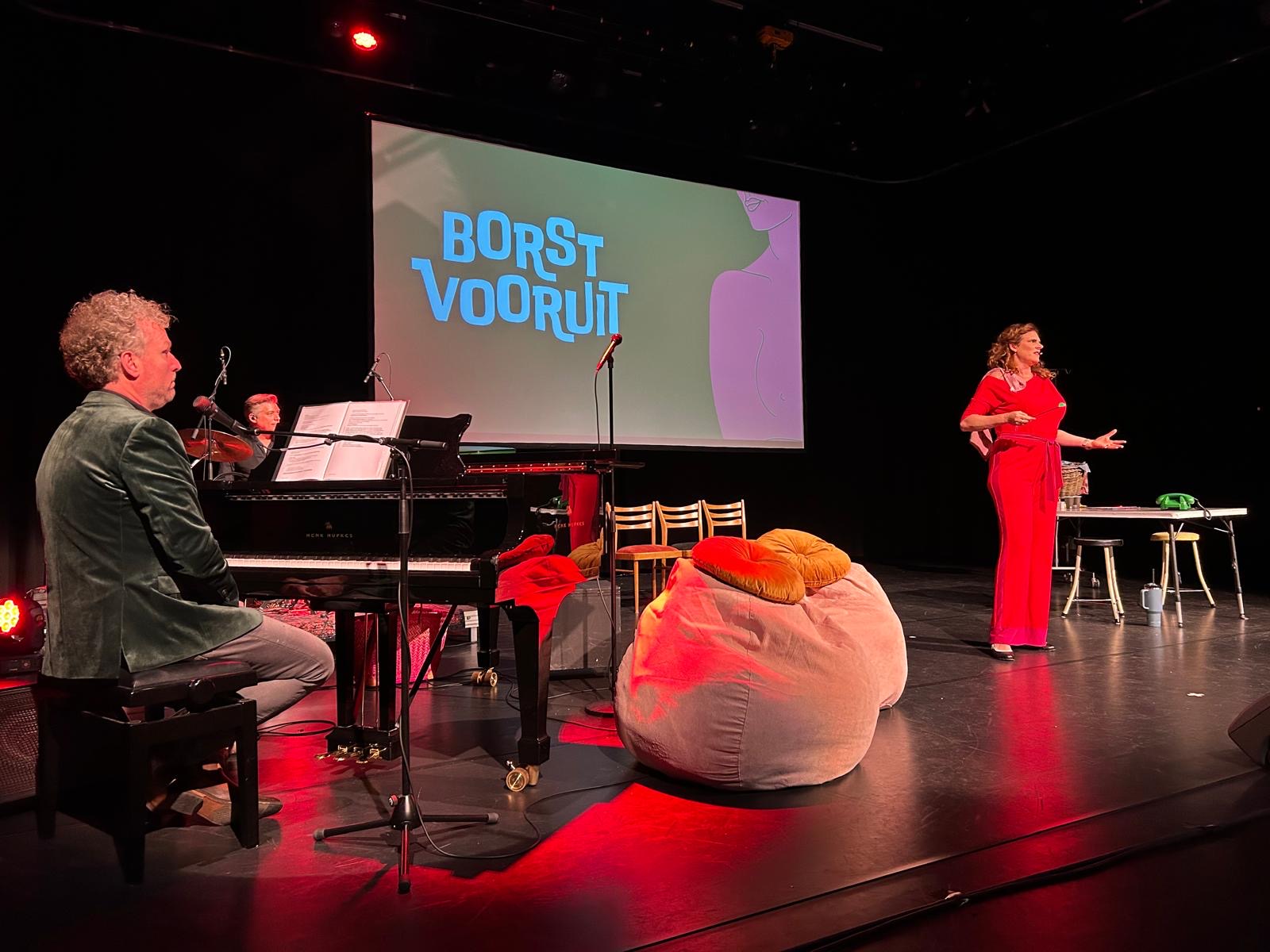 Op onderstaande foto's: sprekers en muziek tijdens de theatervoorstelling 'Borst Vooruit'