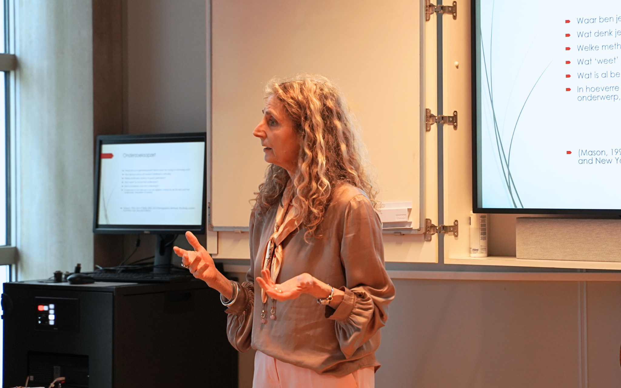 “Soms heb je studenten die kwalitatief onderzoek erg moeilijk vinden. Kwantitatief onderzoek is vaak meer gestructureerd. Kwalitatief onderzoek vraagt om creativiteit en aanpassingsvermogen. Je kunt het nog zo goed uitdenken, maar in de praktijk zijn misschien wel andere vragen nodig dan je van tevoren had bedacht. Of dat je bedacht had mensen te betrekken die je in de praktijk helemaal niet kunt betrekken. Dat kan onzekerheid met zich meebrengen. Het is dan als docente belangrijk dat je vragen stelt en de student(e) zelf met oplossingen laat komen. Daarbij wil je een student(e) zo goed mogelijk ondersteunen, stimuleren en laten zien wat wel goed gaat. Aan de hand hiervan help je diegene weer op weg.”