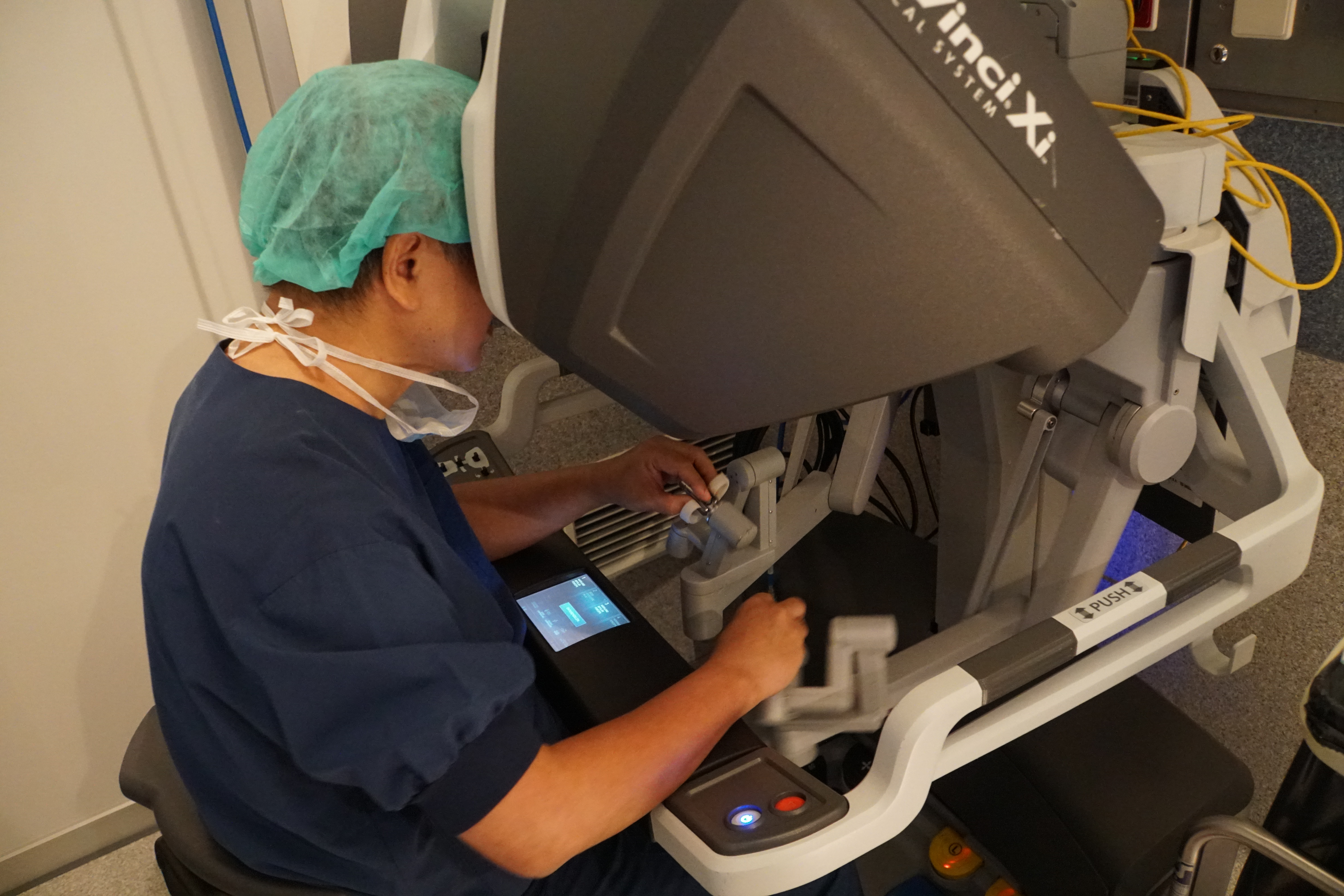 De chirurg bestuurt de vier armen van de operatierobot met joysticks vanuit een soort cockpit (zie foto), terwijl een chirurgisch team ondersteunt bij de operatietafel. Het bij de donor uitgenomen deel van de lever wordt schoongespoeld en vervolgens bij de ontvanger getransplanteerd. Deze delicate dubbele ingreep wordt vrijwel gelijktijdig uitgevoerd.
