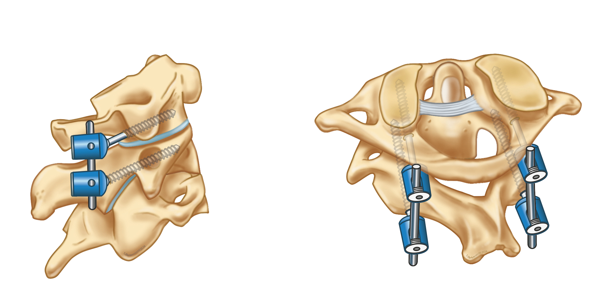 Side and rear view of a surgery in which the first two cervical vertebrae are fused. This procedure provides stability after a dens fracture. (Source: S. Blankevoort, 2024)