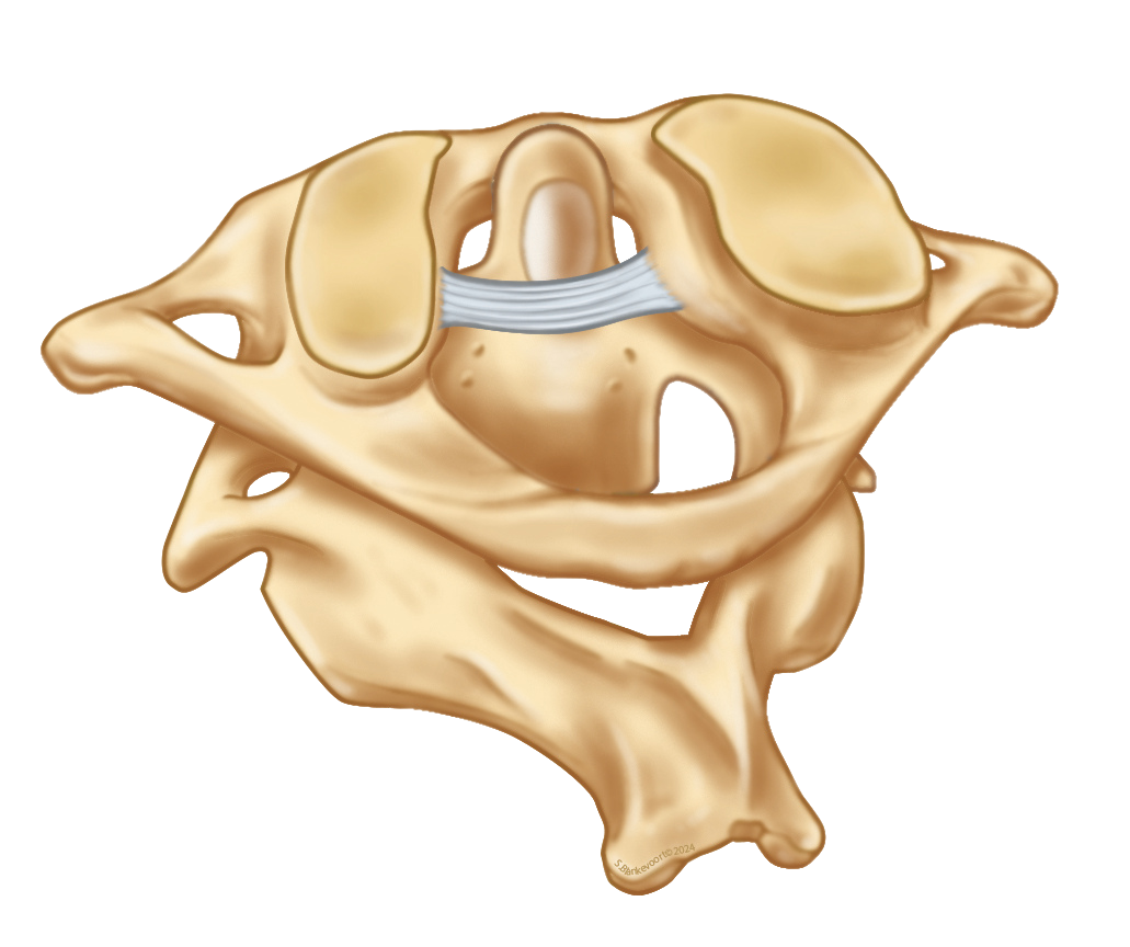 The first two cervical vertebrae, the atlas (top) and the axis (bottom). On the axis sits a bony protrusion: the dens. This part enables head movement but can break in a fall or accident. (Source: S. Blankevoort, 2024)