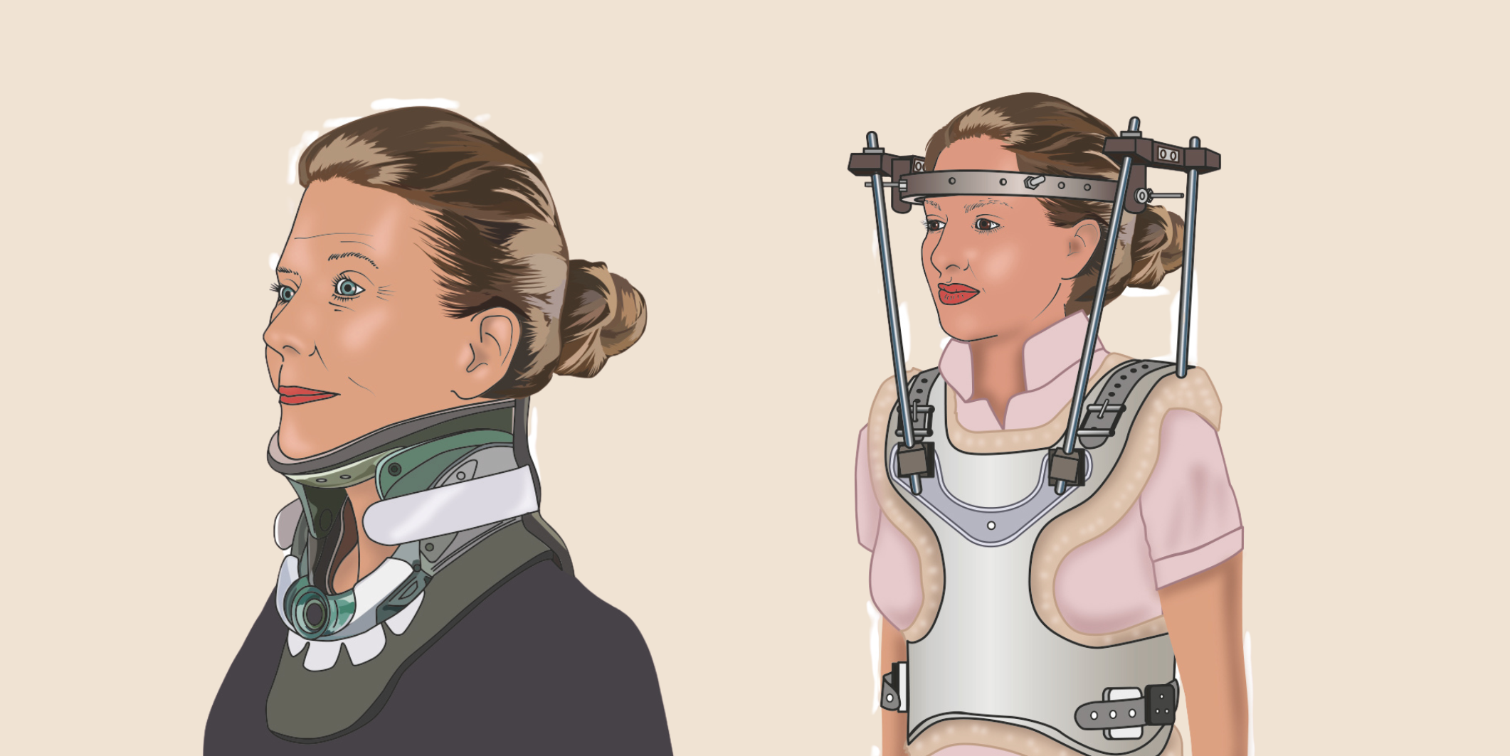 Illustrations of a person with a neck collar (left) and halo vest (right). (Source: S. Blankevoort, 2024)