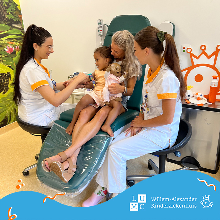 Een poliklinische afspraak in het Willem-Alexander Kinderziekenhuis start met wegen en meten, daarna volgt het bezoek aan de kinderendocrinoloog.